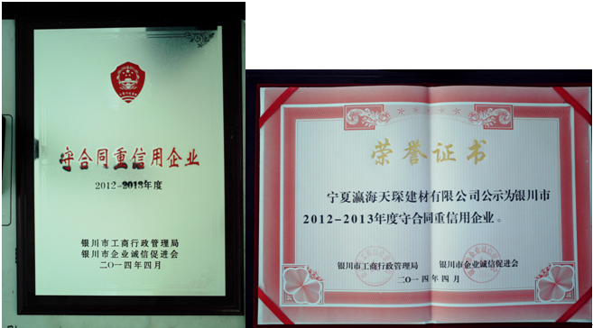 2014年4月29日,銀川市工商局、銀川市企業(yè)誠信促進會在《法制新報》上公告“守合同重信用企業(yè)”,寧夏瀛海天琛建材有限公司獲此殊榮。